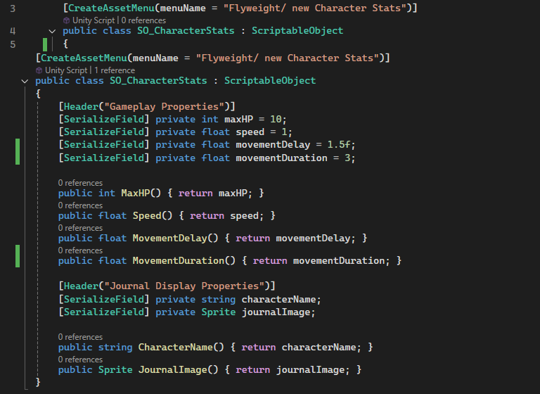 Having the properties centralized using a scriptable object proved to be useful because whenever the designer wanted to change the properties they knew they only needed to go to one place to change values and it will apply to all instances of the . A bonus to using the flyweight pattern with scriptable objects is that you can change values in runtime and it will persist when you stop the editor.