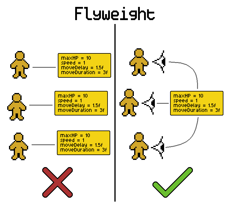 The flyweight pattern is an easy way to optimize code, and make your designers’ lives much easier by centralizing data. For example, you have ten instances of an NPC with a maxHP, movement speed, and delays for their movement. Would it be better for each of them use memory to hold onto these static stats, or would it be better if they all just reference the same object containing all the data? In all the projects I’ve worked on, the latter was the better option.